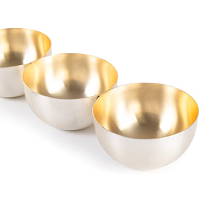 A set of three small bowls made of stainless steel, featuring a golden finish on the interior and a matte exterior. The design is simple and elegant.