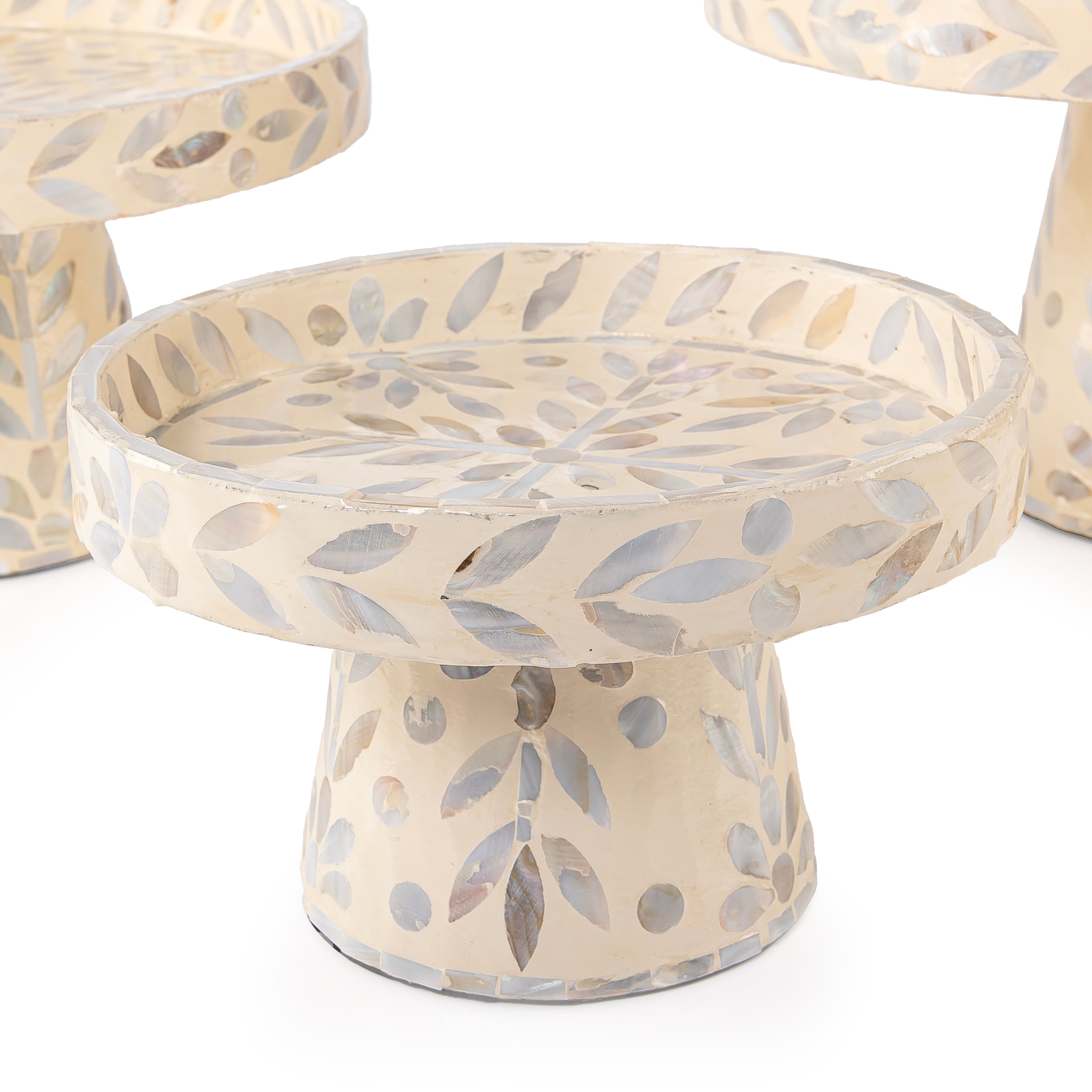 A set of 3 stands made entirely of mother of pearl, available in different sizes.