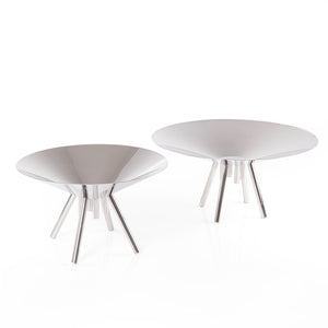 A set of two serving stands made of stainless steel, featuring a deep rounded design and a tripod base for added stability and modernity.
