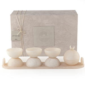 A set consisting of 4 resin bowls with a serving tray. One of the bowls comes with a crescent-shaped lid.