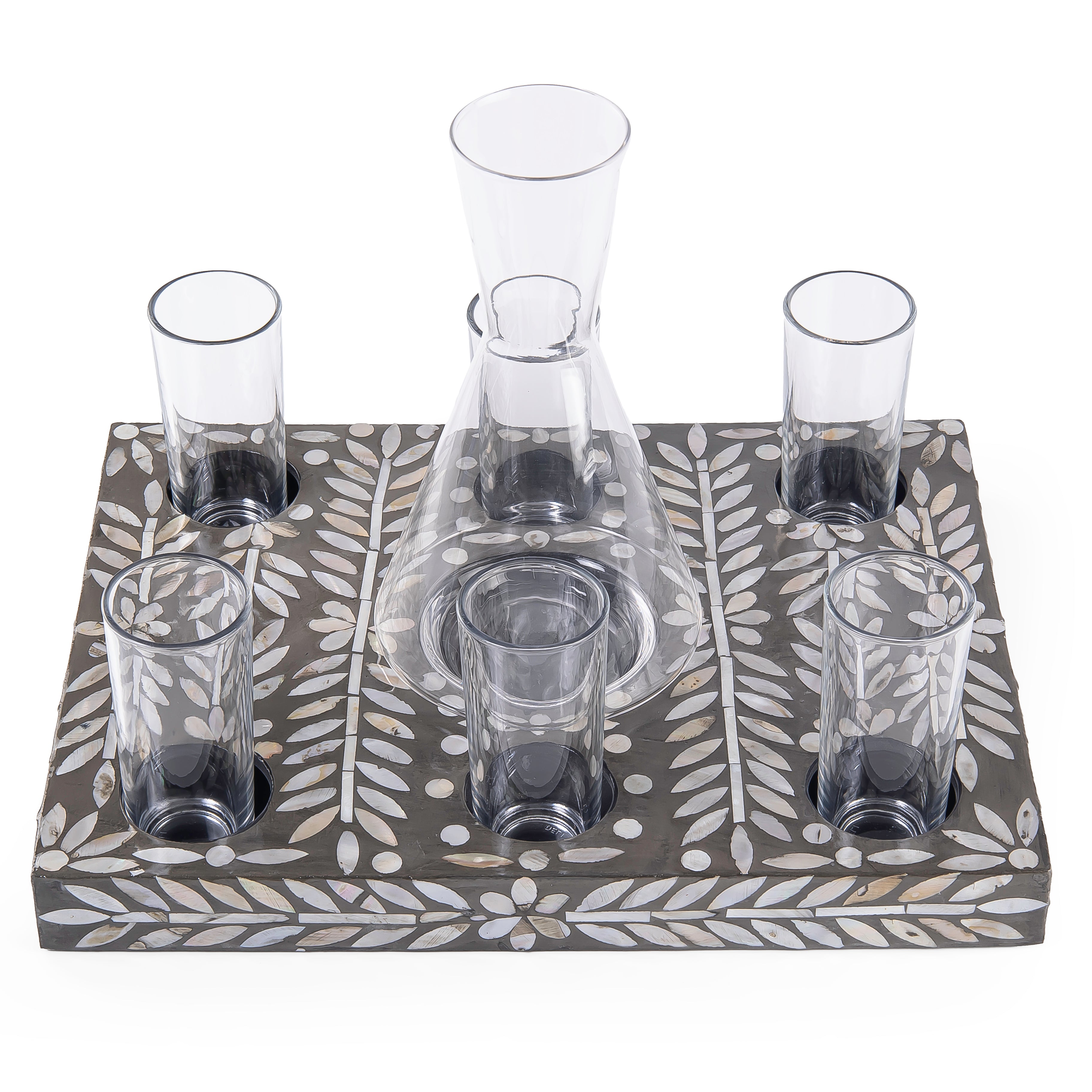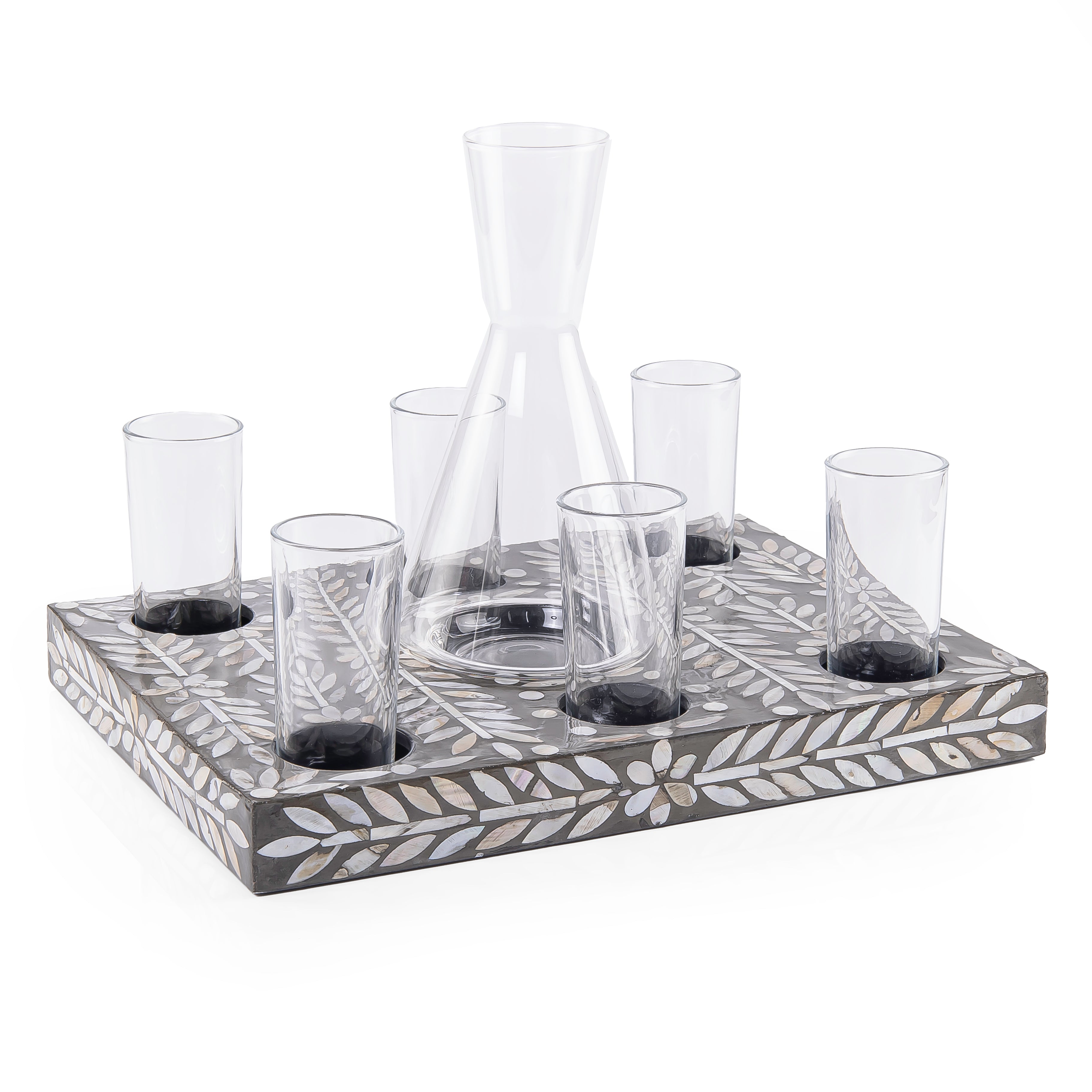 Material and Design: A set consisting of a wooden tray with shell inlays, featuring 6 glass cups and a pitcher for serving beverages. The set is presented in a gift box.