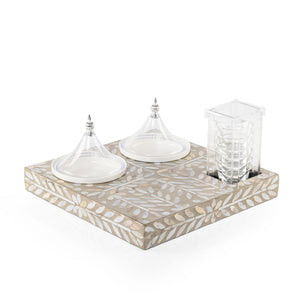 Material and Design: A set consisting of a wooden tray with mother of pearl inlays, featuring 2 ceramic dishes with covers and an acrylic cup holder. The set is presented in an elegant gift box.
