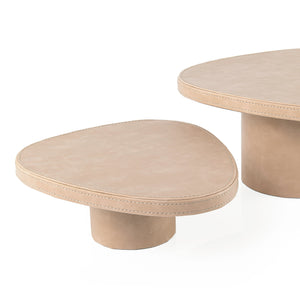 Set of 2 Leather Covered Wooden Stands with Cylindrical Bases - Beige