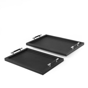Set of 2 Rectangular Wooden Serving Trays Wrapped with Leather - Black
