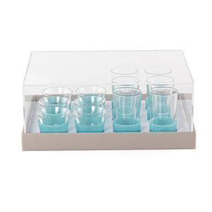A rectangular tray wrapped leather, featuring 12 beige resin cups (6 tea glasses & 6 coffee cups) enclosed with a transparent acrylic cover for protection.