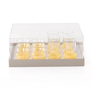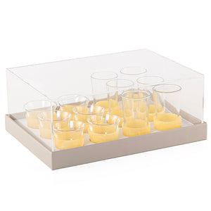 A rectangular tray wrapped leather, featuring 12 beige resin cups (6 tea glasses & 6 coffee cups) enclosed with a transparent acrylic cover for protection.