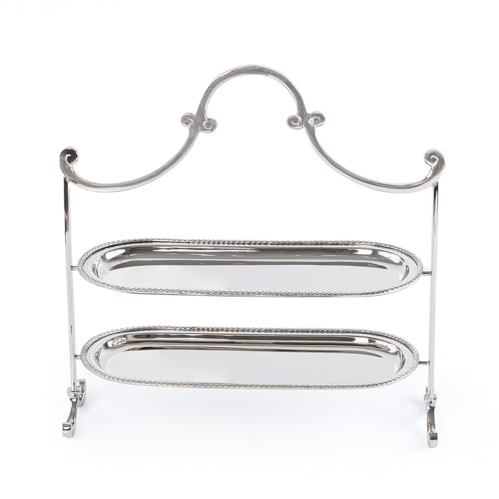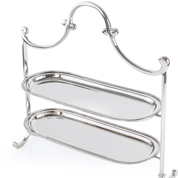 A stainless steel serving stand with two elevated oval tiers, offering a practical design for an organized presentation.