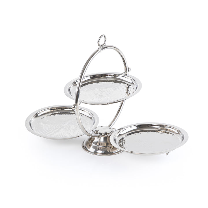 A stainless steel serving stand with three elevated tiers, offering a practical design for an organized presentation.