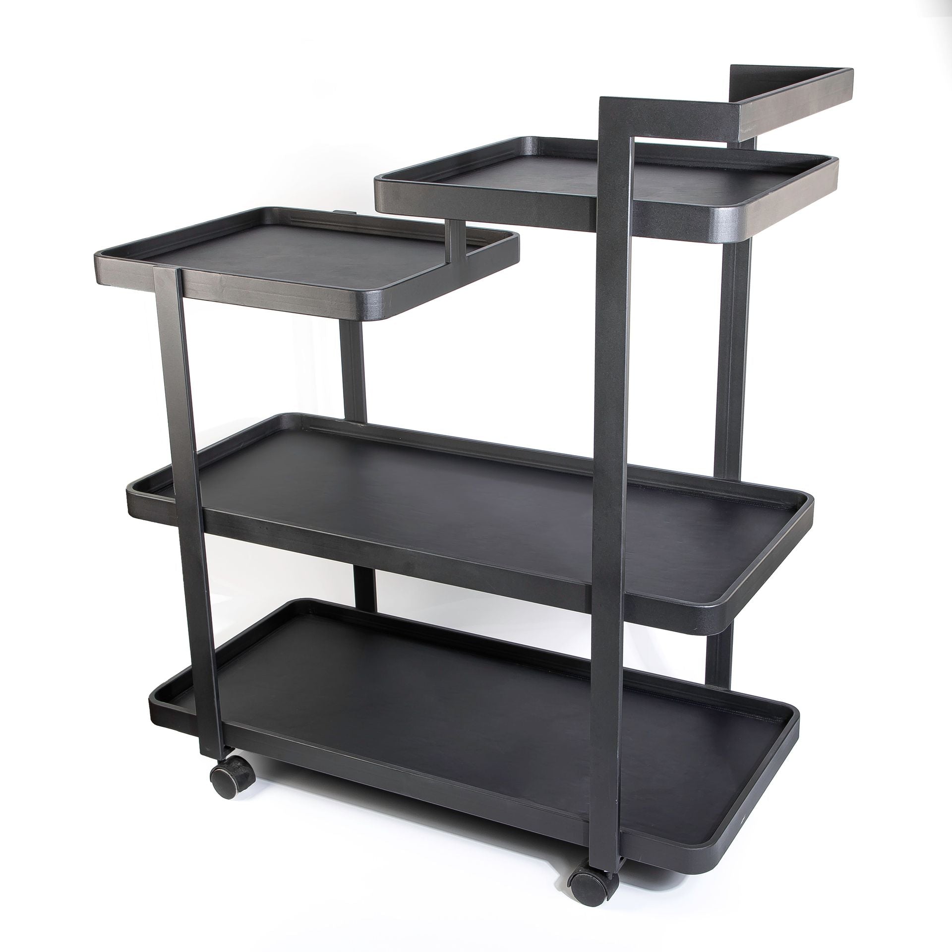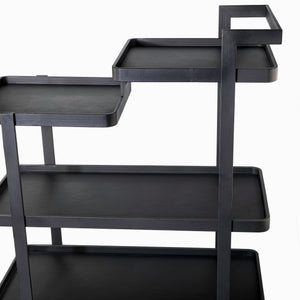 A flat black metal trolley featuring 4 designer wooden shelves, wrapped in bright black skin-pattern leather. Combines functionality with a luxurious appearance, perfect for serving or as a statement decor piece.