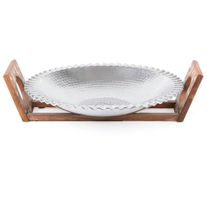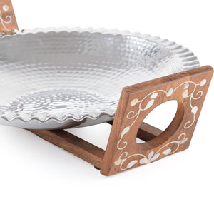 Aluminum Dish with Wooden Stand Inlaid with Mother of Pearl - Large