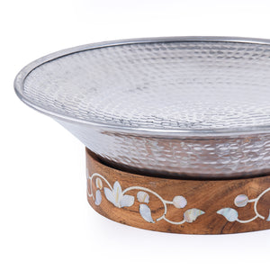 Elevate your table presentation with this striking metal stand, expertly crafted to combine form and function. The generous serving platform features a robust metal construction paired with warm wood accents and lustrous mother-of-pearl detailing on the base, creating a sophisticated focal point for any dining occasion. Ideal for displaying appetizers, desserts, or decorative pieces, this stand brings refined elegance to both formal gatherings and everyday entertaining. The weighted base ensures stability while the premium materials showcase exceptional craftsmanship.