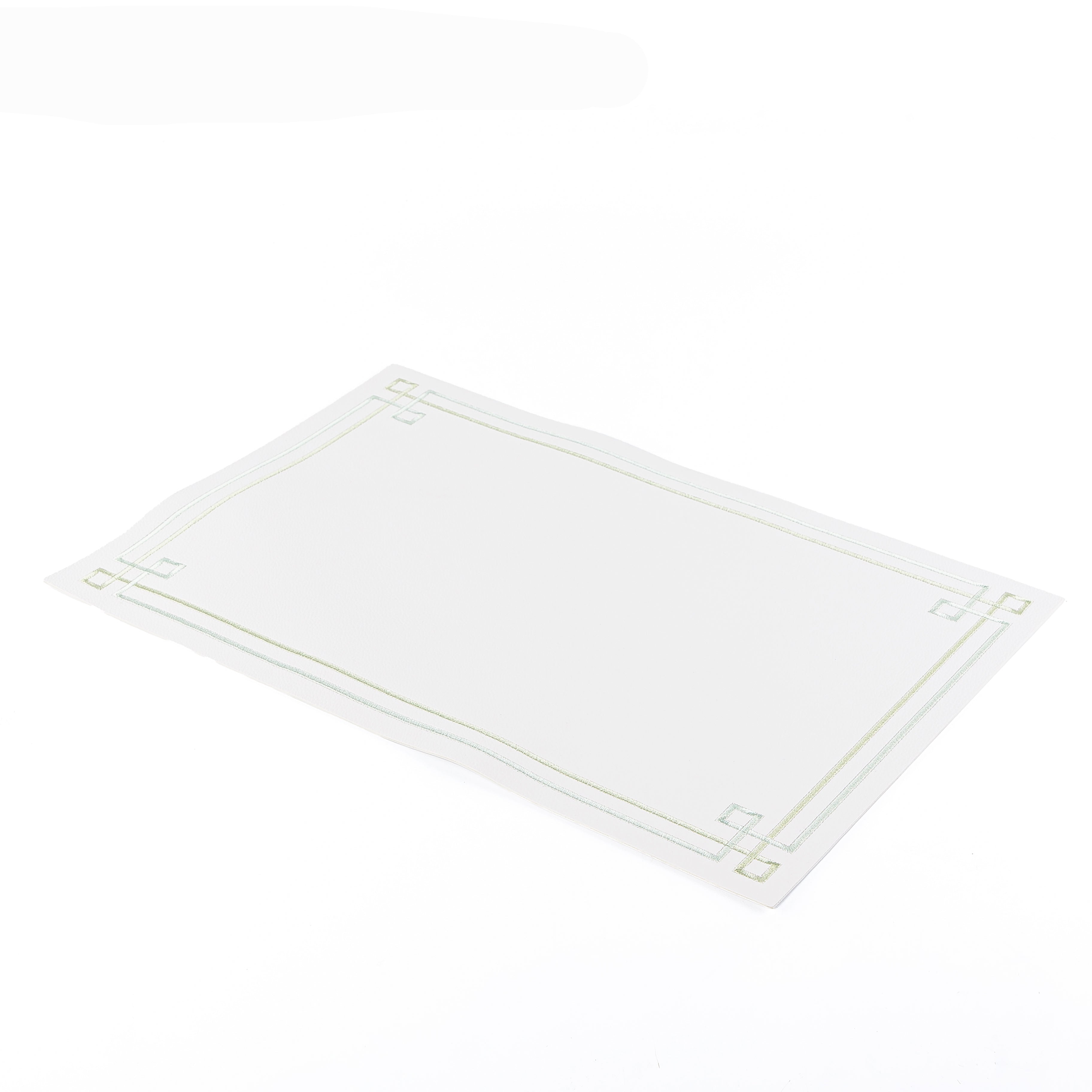 Transform your dining experience with this elegant faux leather placemat, combining timeless white with sophisticated green accents. Engineered from premium synthetic leather, it delivers authentic luxury aesthetics while offering superior practicality for everyday use. The durable material resists stains, spills, and wear, requiring only effortless wiping for maintenance. Its refined color palette complements any table setting, from casual gatherings to formal occasions. The faux leather construction provides a soft, sophisticated feel underhand while protecting your table surface. Ideal for households seeking stylish, low-maintenance table linens that maintain their appearance through frequent use and washing. An intelligent investment in both aesthetics and functionality for the discerning home.