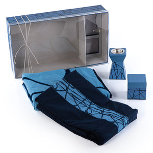 an incense burner and a box for incense are made of reinforced cardboard covered with paper decorated with drawings , a prayer mat, Prayer dress , Prayer mat all in the Cardboard box with acrylic cover, wrapped with blue color printed paper.