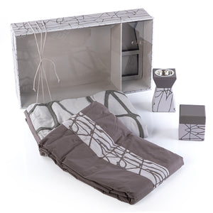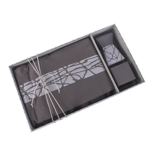 an incense burner and a box for incense are made of reinforced cardboard covered with paper decorated with drawings , a prayer mat, Prayer dress , Prayer mat all in the Cardboard box with acrylic cover, wrapped with grey color printed paper.