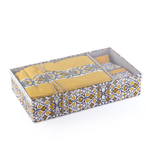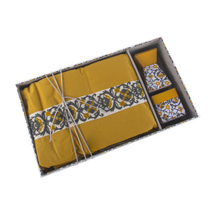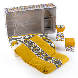 an incense burner and a box for incense are made of reinforced cardboard covered with paper decorated with drawings , a prayer mat, Prayer dress , Prayer mat all in the Cardboard box with acrylic cover, wrapped with yellow color printed paper.