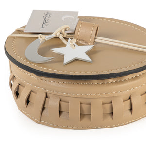A round box made of leather with a braided design around the edges, featuring a circular lid with a leather handle.
