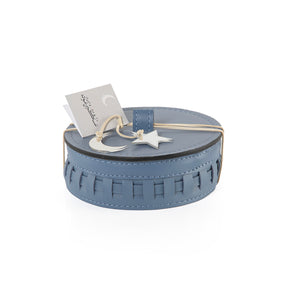 A round box made of leather with a braided design around the edges, featuring a circular lid with a leather handle.