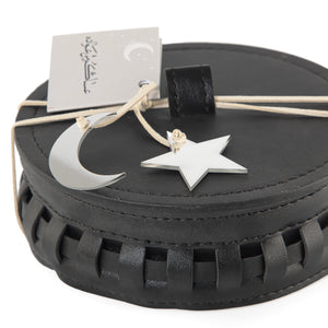A round box made of leather with a braided design around the edges, featuring a circular lid with a leather handle.