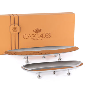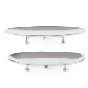 Elevate your table presentation with this elegant set of two oval metal stands featuring sturdy legs and a polished silver finish. Perfect for serving appetizers, desserts, or displaying decorative pieces at dinner parties and special occasions, these versatile servware pieces add sophistication to any gathering. The durable metal construction ensures lasting quality, while the classic design complements both modern and traditional décor. Comes beautifully packaged in a gift box, making it an ideal present for those who appreciate refined entertaining essentials.