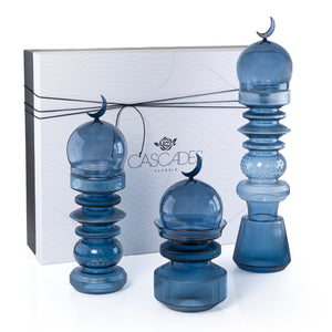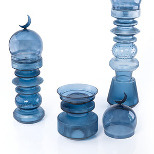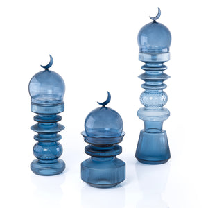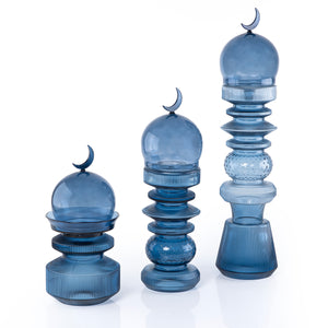 Elevate your table setting with this sophisticated glass collection, thoughtfully curated for the discerning host. The set features two elegantly designed minaret-inspired decorative pieces that capture the essence of Islamic architecture, paired with a practical date bowl—perfect for serving dates during Ramadan or as everyday tableware. Crafted in rich blue glass, each piece combines aesthetic refinement with functional design. Presented in an attractive gift box, this set makes an ideal present for those who appreciate cultural elegance and quality craftsmanship. A versatile addition to any home that celebrates tradition and style.