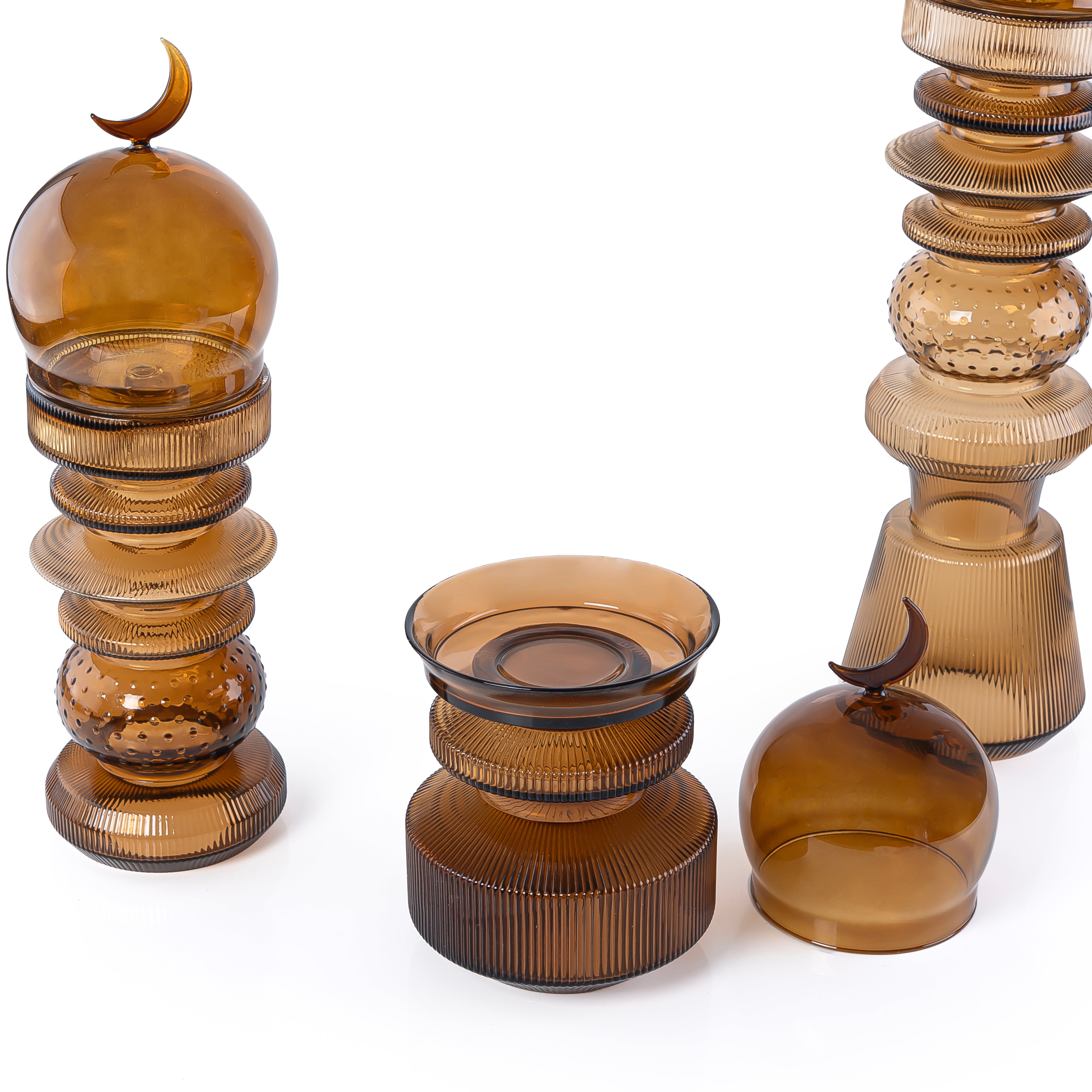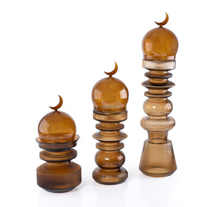 Elevate your table setting with this sophisticated glass collection, thoughtfully curated for the discerning host. The set features two elegantly designed minaret-inspired decorative pieces that capture the essence of Islamic architecture, paired with a practical date bowl—perfect for serving dates during Ramadan or as everyday tableware. Crafted in rich brown glass, each piece combines aesthetic refinement with functional design. Presented in an attractive gift box, this set makes an ideal present for those who appreciate cultural elegance and quality craftsmanship. A versatile addition to any home that celebrates tradition and style.