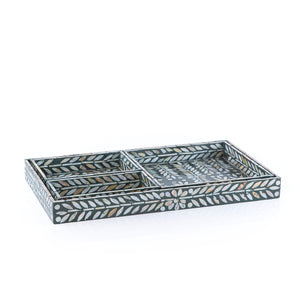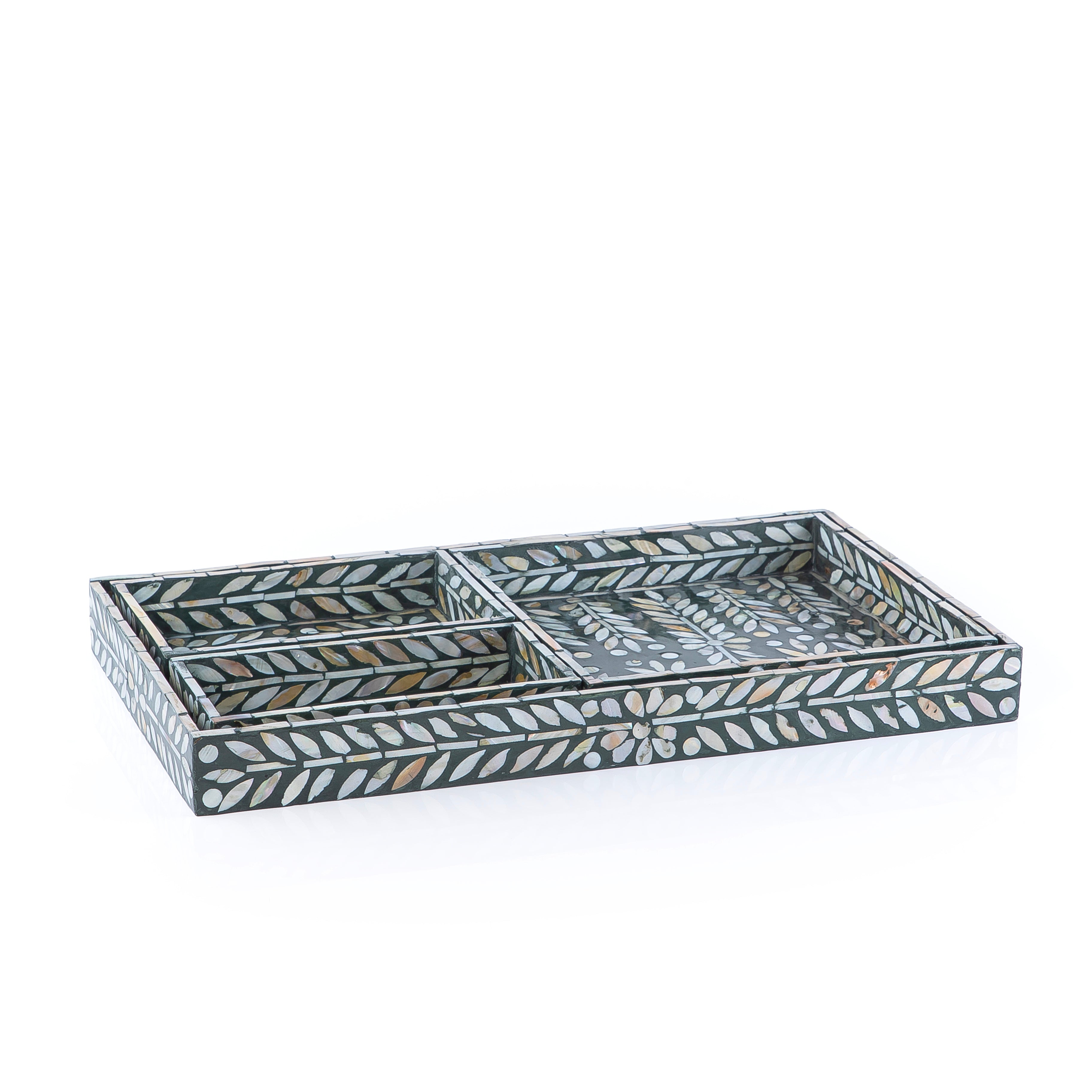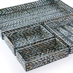 Elevate your home organization with this sophisticated mother-of-pearl tray set. Featuring four graduated sizes in elegant green, each piece showcases the lustrous, iridescent finish characteristic of premium mother-of-pearl. Perfect for displaying jewelry, organizing desk essentials, or serving refreshments, these versatile trays combine functionality with refined aesthetics. The natural variations in each tray's pearlescent surface ensure every set is uniquely beautiful. An ideal addition to contemporary or traditional interiors seeking understated luxury.