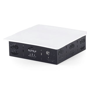 A ceramic plate with a sturdy metal base, featuring a perforated design showcasing palm trees in an artistic style.