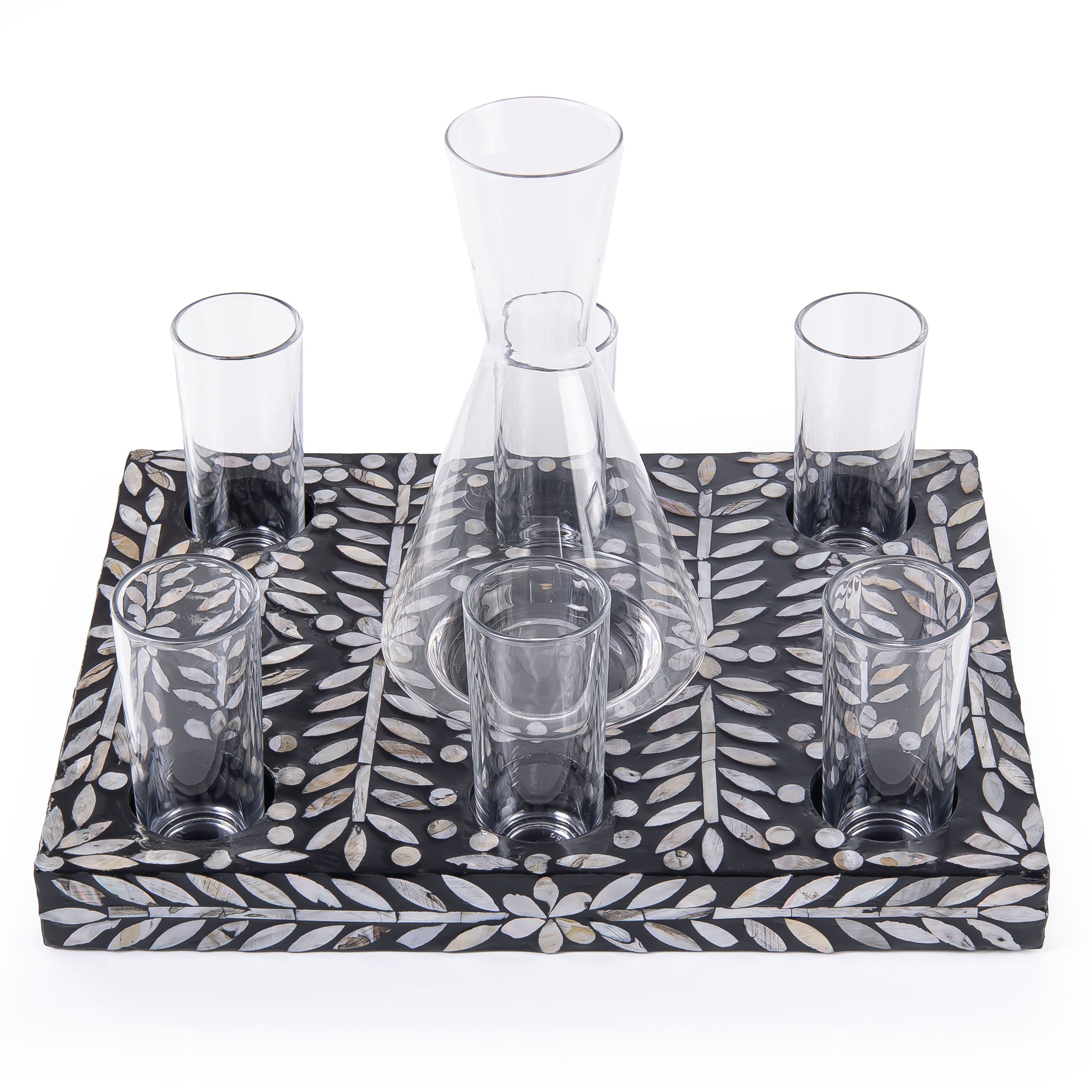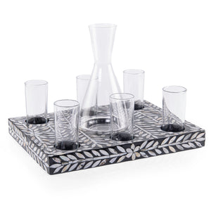 Material and Design: A set consisting of a wooden tray with shell inlays, featuring 6 glass cups and a pitcher for serving beverages. The set is presented in a gift box.