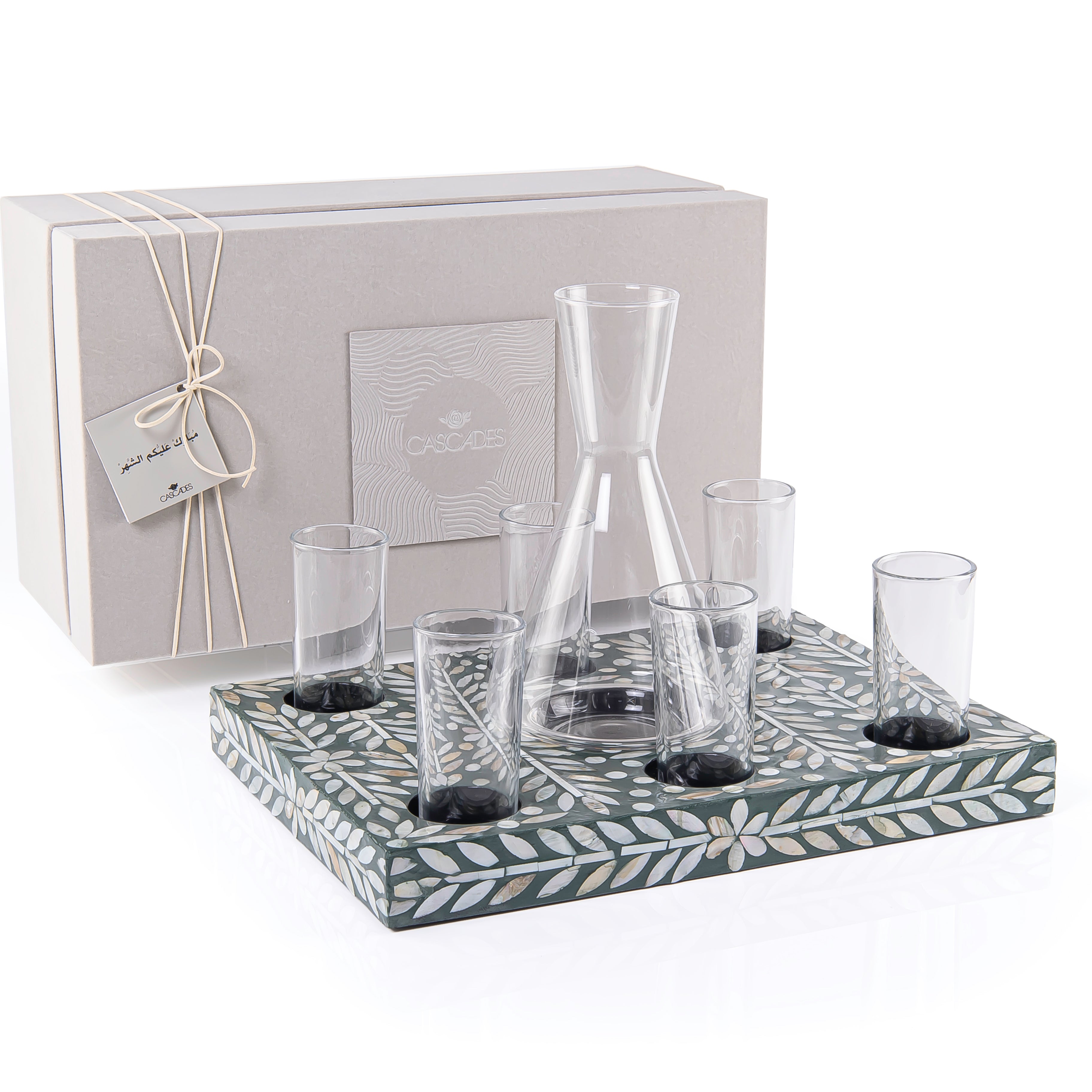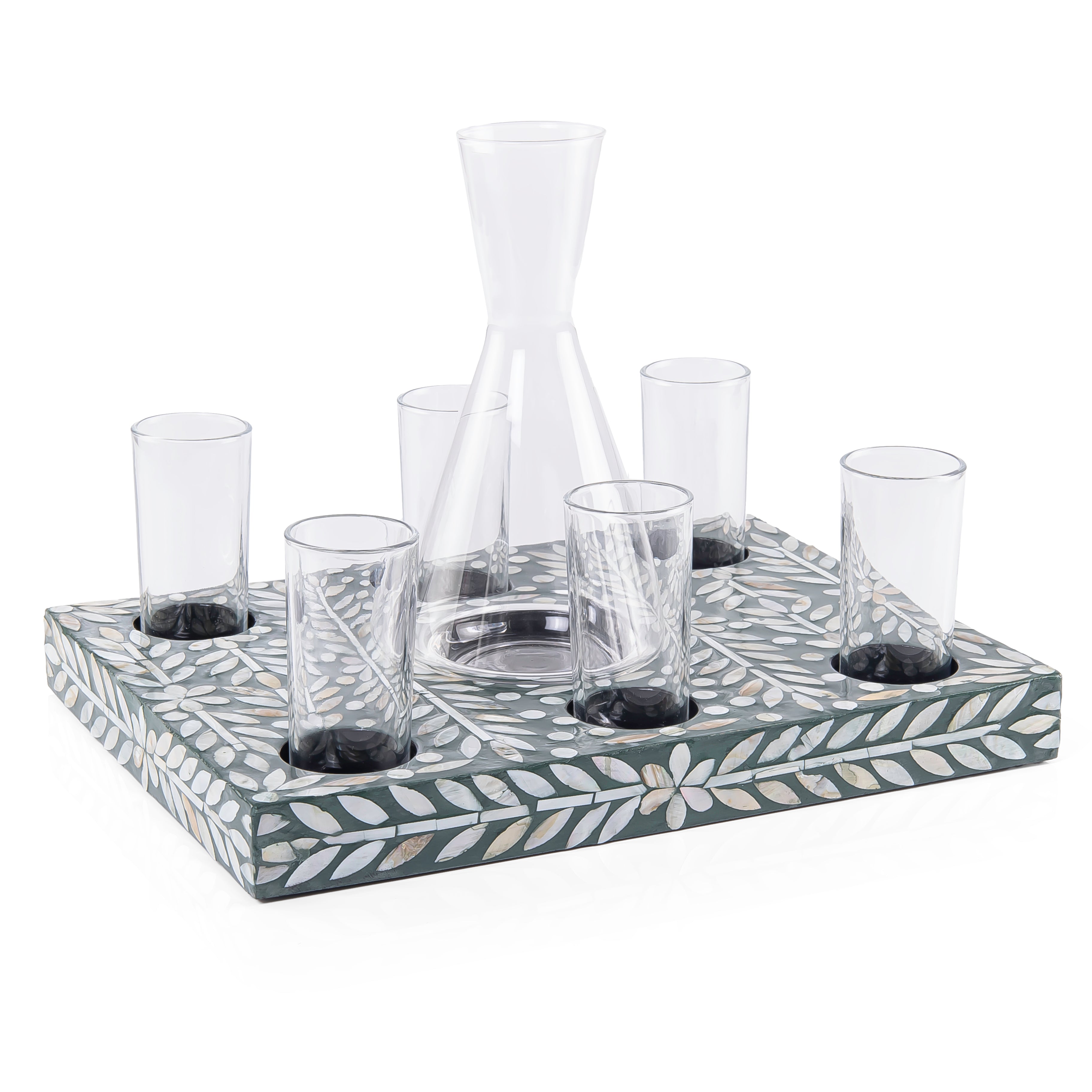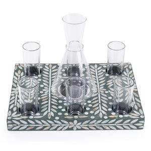 Material and Design: A set consisting of a wooden tray with shell inlays, featuring 6 glass cups and a pitcher for serving beverages. The set is presented in a gift box.