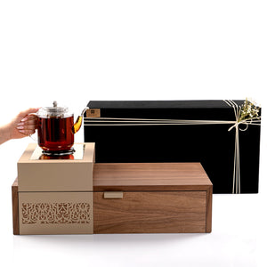 It is a beautiful electric serving tray made of wood and metal, featuring a drawer that holds 6 tea glasses, 6 coffee cups, and 6 marble coasters. It also includes 3 easy-to-clean acrylic boxes, making it an essential piece for any home. Presented in a luxurious gift box, it's the perfect addition to any space.