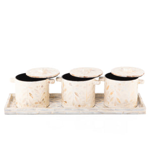 طقم مكوّن من 3 علب مصنوعة من الخشب ومزينة بالصدف مع أغطية متناسقة، موضوع على صينية مستطيلة لتقديم منظم وأنيق.