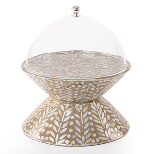 ستاند كيك مصنوع من المعدن ومزين بالصدف الطبيعي، مع قاعدة مزدوجة تمنحه شكلًا فريدًا. مزود بغطاء أكريليك شفاف يحمي الحلويات ويعرضها بطريقة أنيقة.