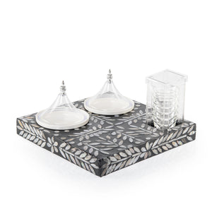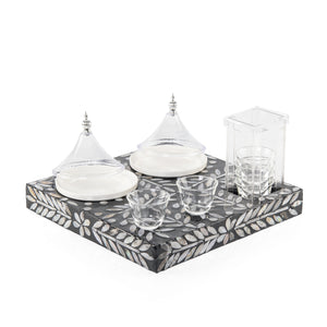 المواد والتصميم: طقم يتكون من صينية خشبية مزخرفة بالصدف، تحتوي على 2 طبق سيراميك بأغطية  وحامل أكواب أكريليك. يتم تقديم الطقم داخل بوكس هدية أنيق.