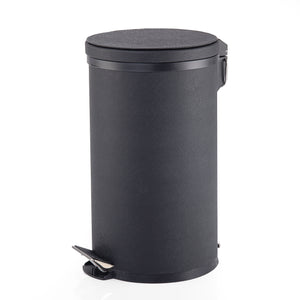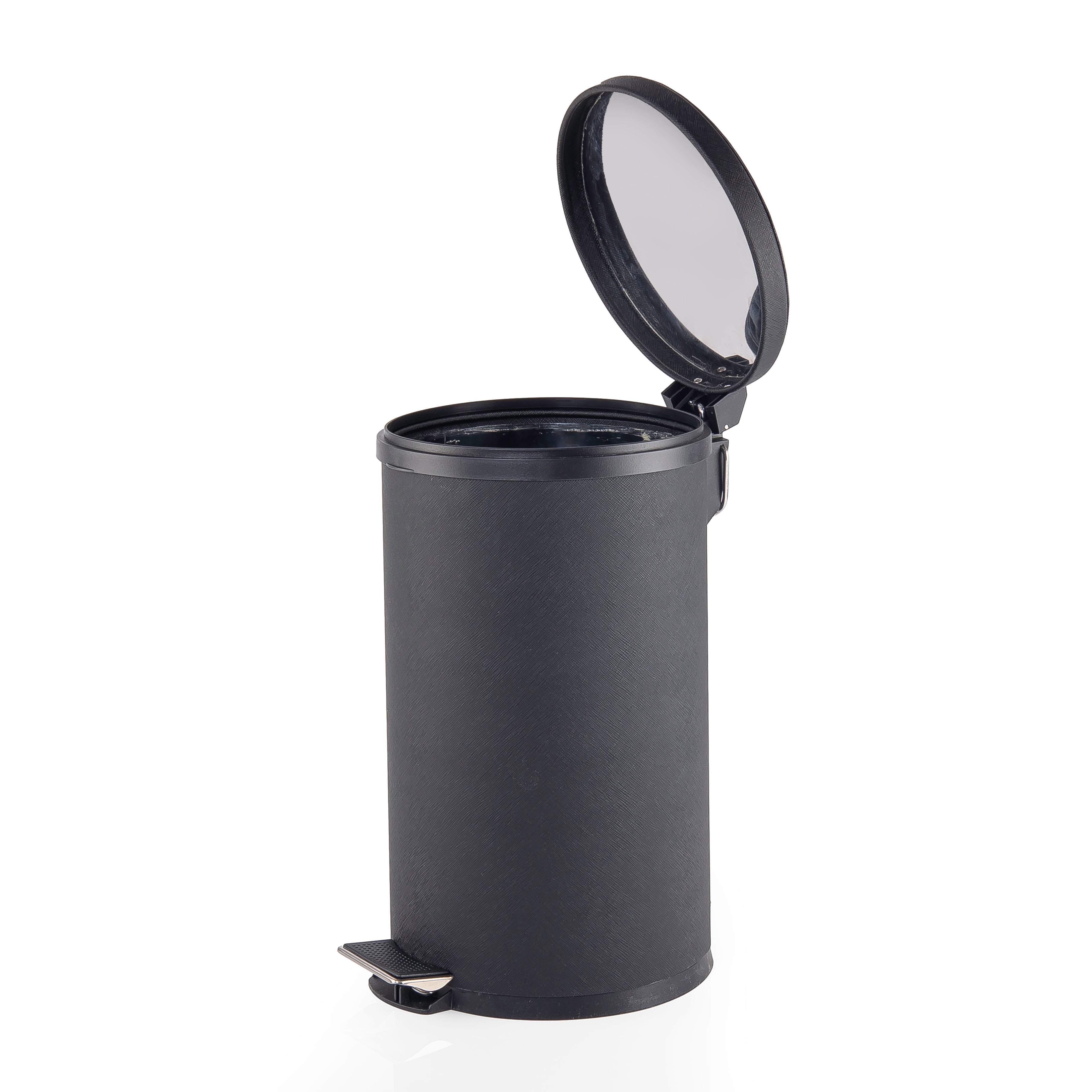 سلة مهملات مصنوعة من المعدن ومغطاة بتلبيسة جلدية، مزودة بدواسة عملية تسهّل فتح الغطاء دون الحاجة إلى استخدام اليدين.