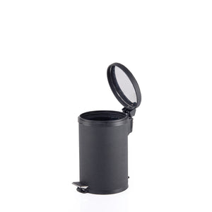 سلة مهملات مصنوعة من المعدن بتلبيسة جلد، مزودة بدواسة قدم لفتح الغطاء بدون استخدام اليدين.