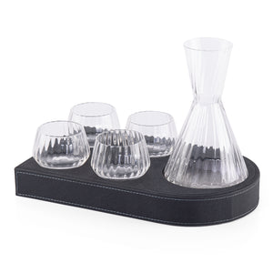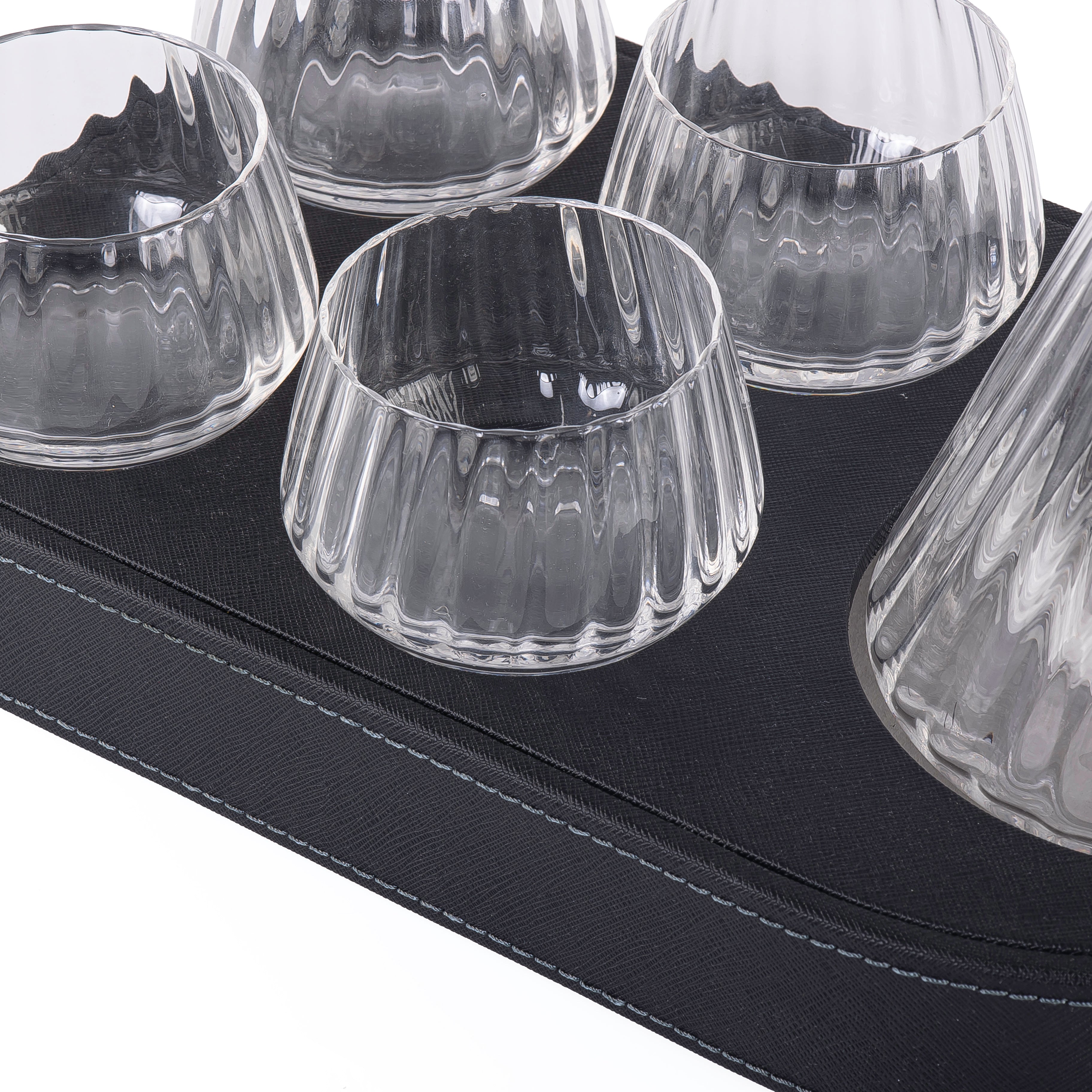 صينية تقديم مصنوعة من الخشب ومغطاة بطبقة من الجلد، تحتوي على 4 أكواب زجاجية وإناء زجاجي، وتأتي مع بوكس هدية.