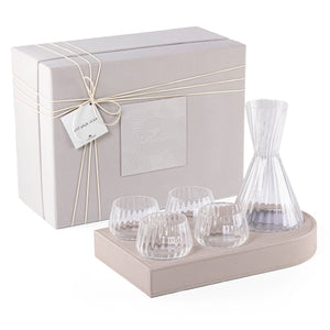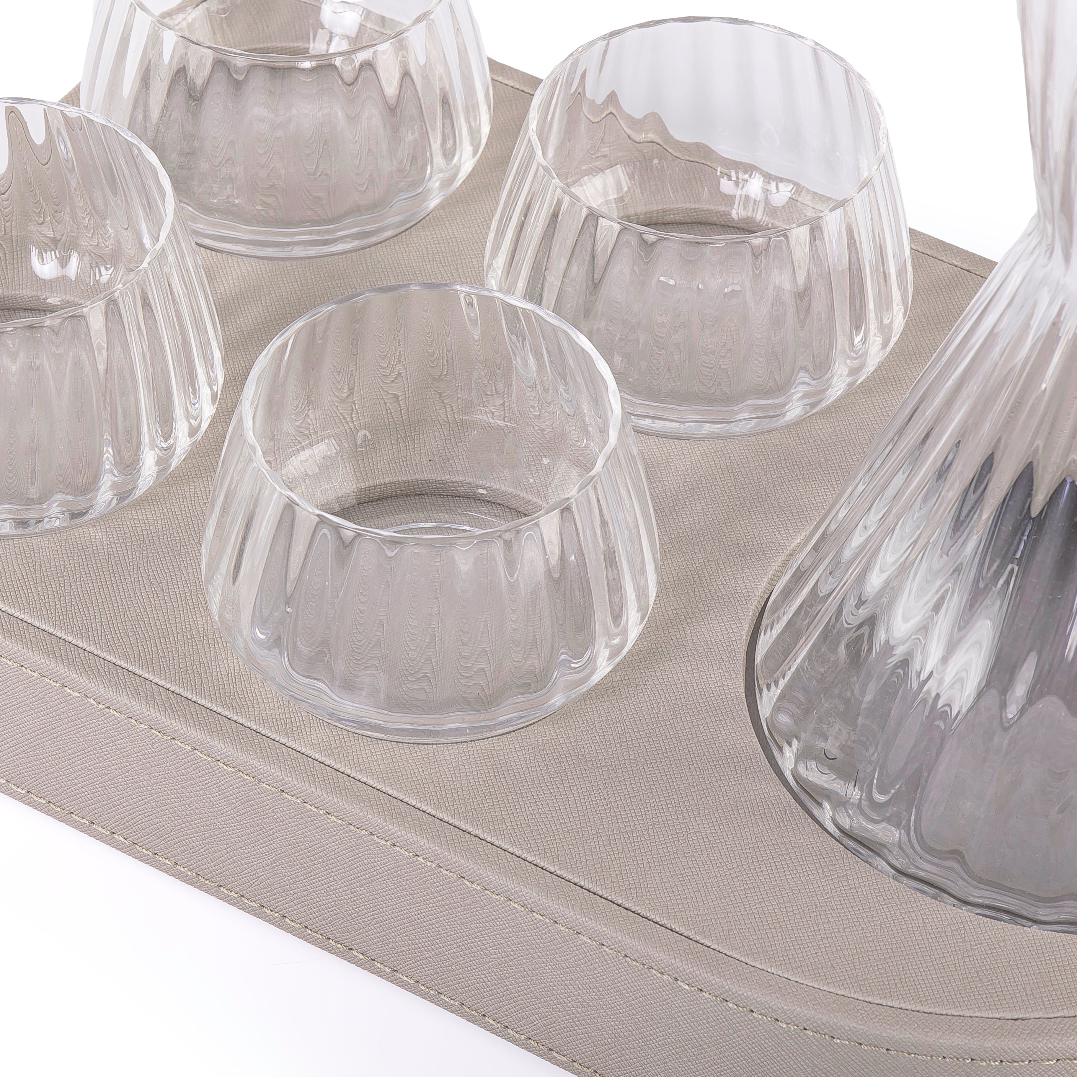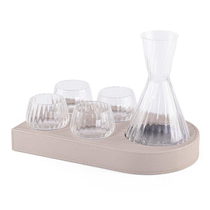 صينية تقديم مصنوعة من الخشب ومغطاة بطبقة من الجلد، تحتوي على 4 أكواب زجاجية وإناء زجاجي، وتأتي مع بوكس هدية.