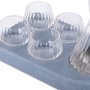 صينية تقديم مصنوعة من الخشب ومغطاة بطبقة من الجلد، تحتوي على 4 أكواب زجاجية وإناء زجاجي، وتأتي مع بوكس هدية.