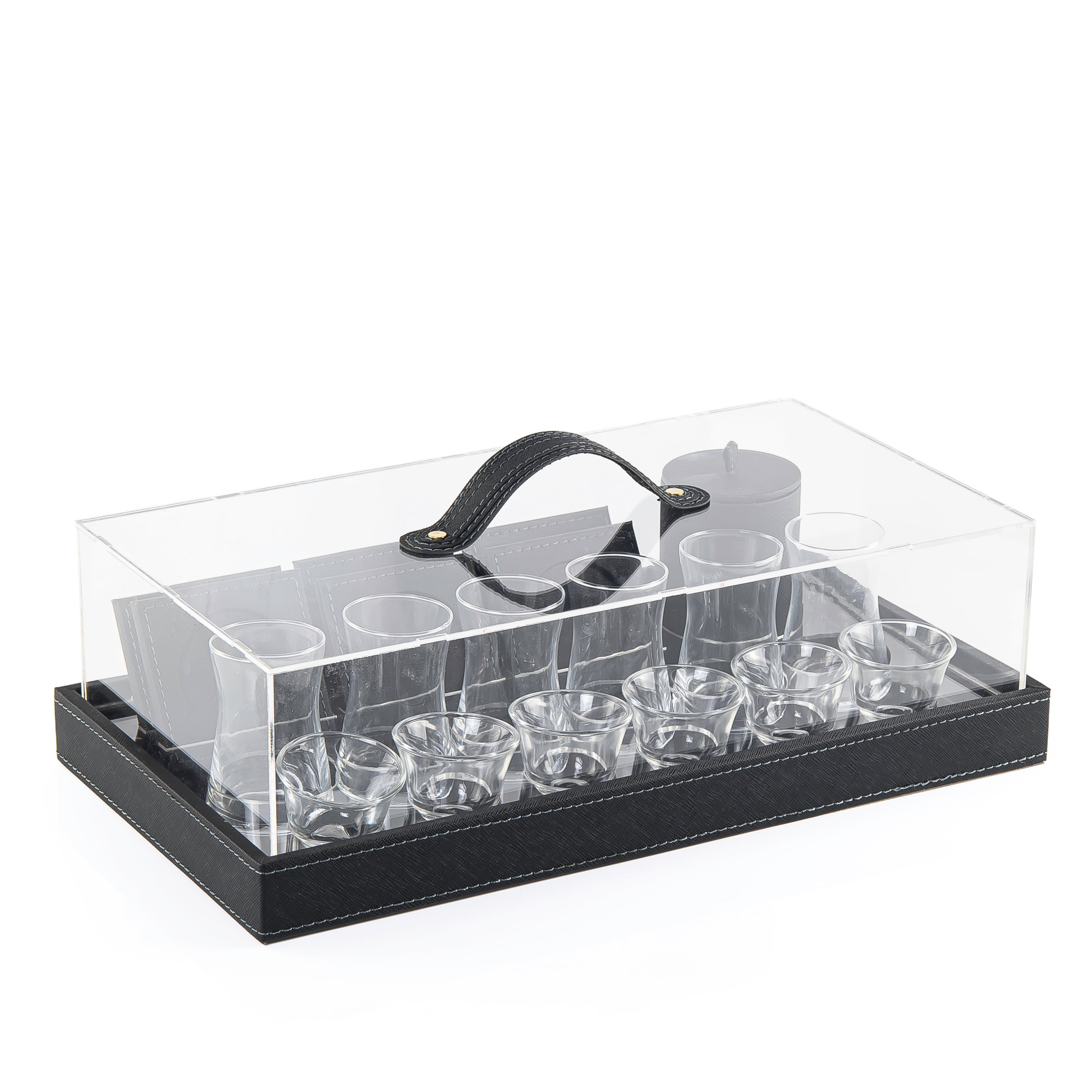 صينية تقديم مصنوعة من الخشب ومغطاة بطبقة من الجلد، مزودة بغطاء أكريليك شفاف ومقبض مريح. الطقم يشمل 6 أكواب شاي و 6 فناجيل قهوة، كوسترات، وعلبة إضافية، ويأتي في بوكس هدية.