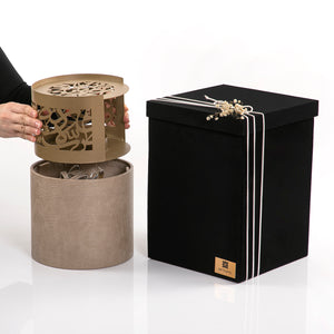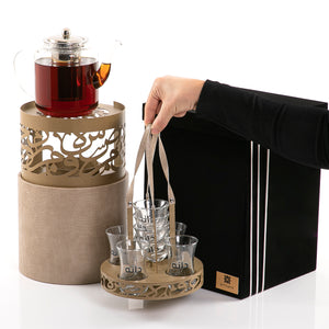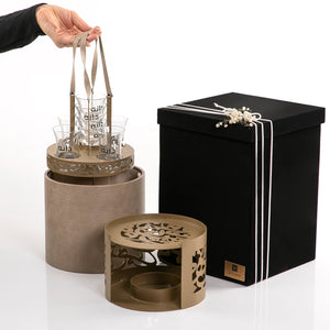 يحتوي الطقم على منقل معدني بنقوش وقاعدة جلدية، مع حامل أكواب دائري يتضمن 4 فناجين  قهوة و4 أكواب شاي . يمكن استخدام الطقم بسهولة سواء في البيت أو الجلسات الخارجية، كما أنه يأتي مع بوكس فاخر  لحفظ القطع أو تقديمه كهدية.