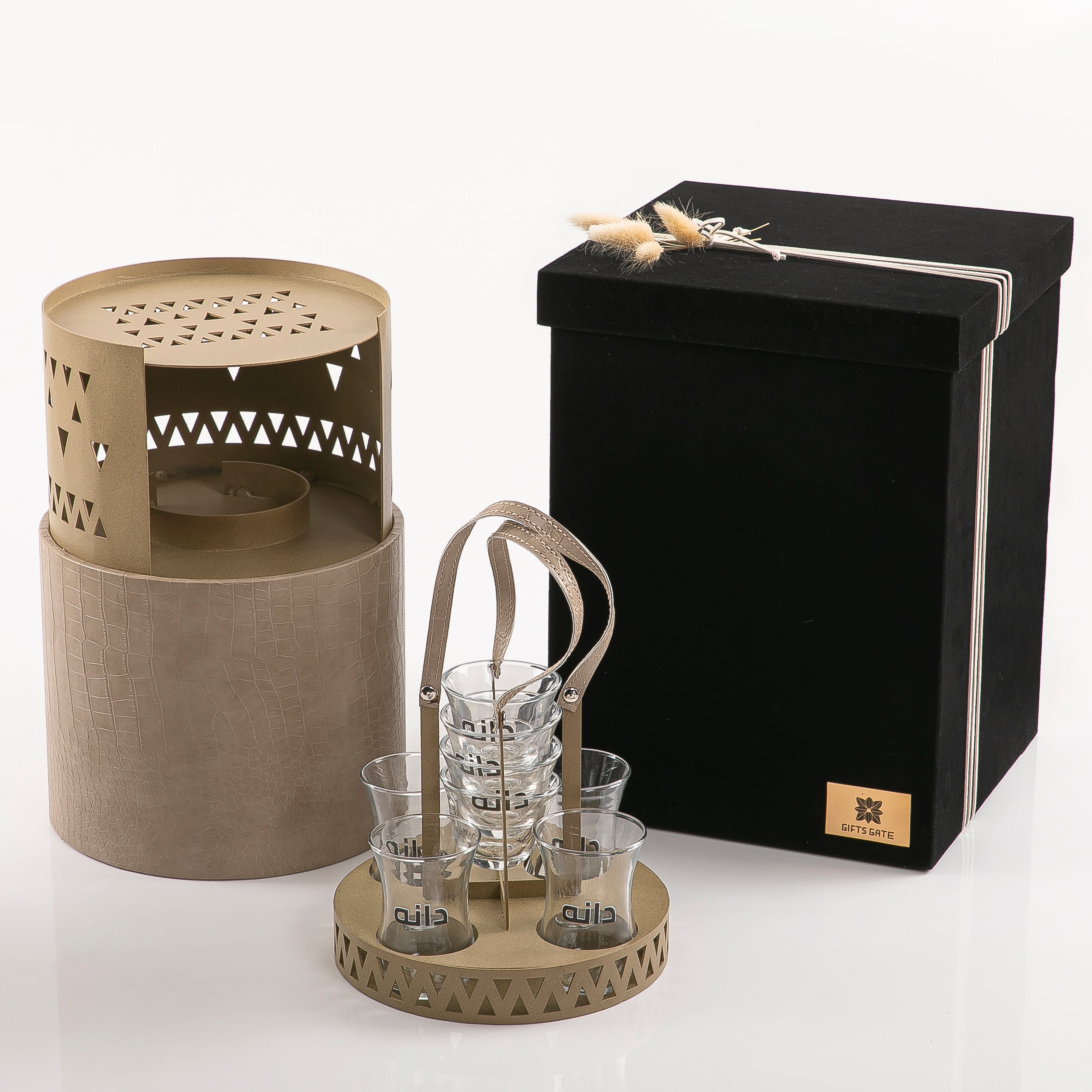 Home طقم منقل معدني مع حامل فناجيل وشاي وقاعدة جلدية مع بوكس هدية