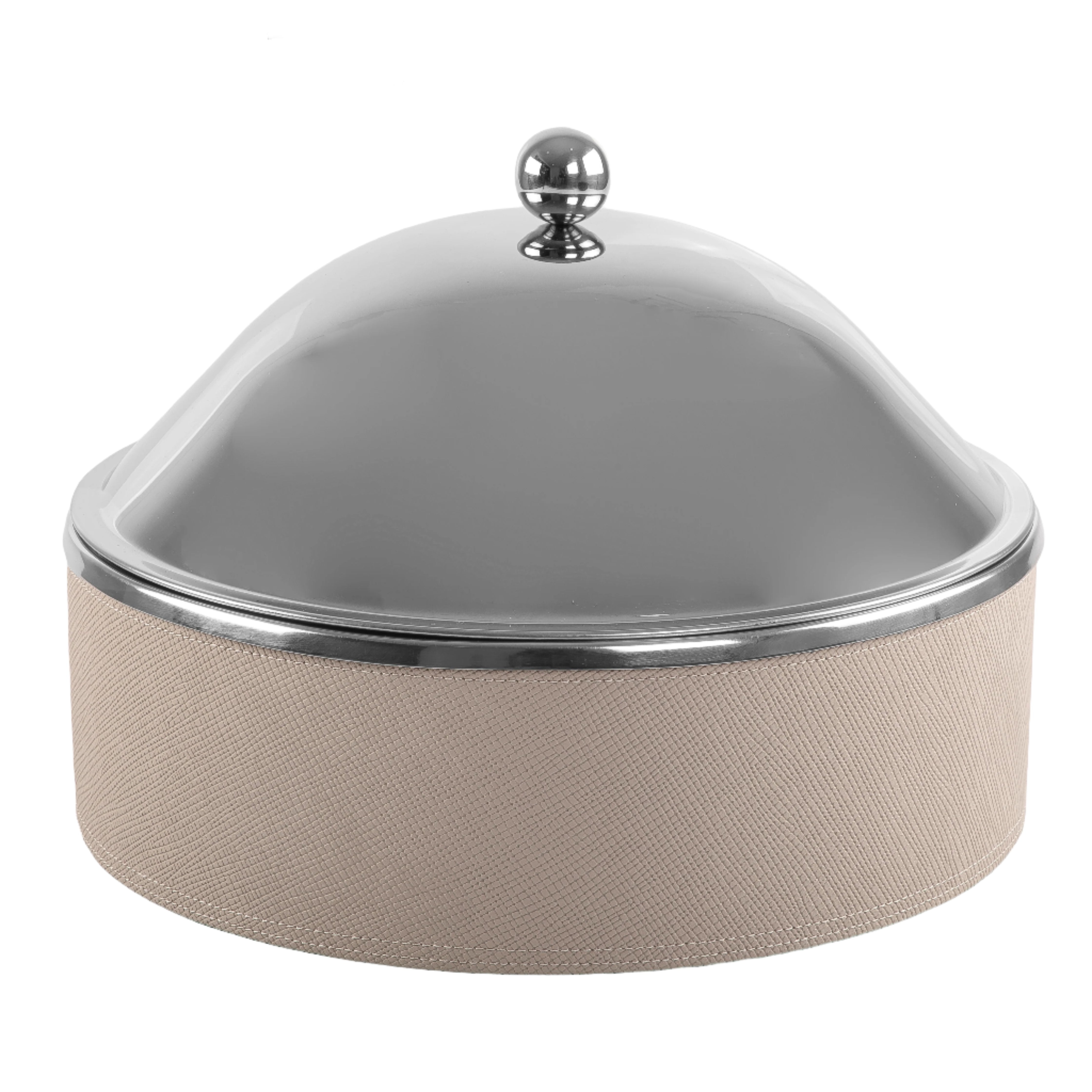 حافظة حرارة دائرية متوسطة الحجم من الإستانلس ستيل، تتميز بقاعدة خشبية متينة، ومغلفة بجلد بيج داكن بشكل أنيق. يجمع تصميمها بين العملية والمظهر الأنيق، مما يجعلها إضافة أنيقة لأي مساحة.