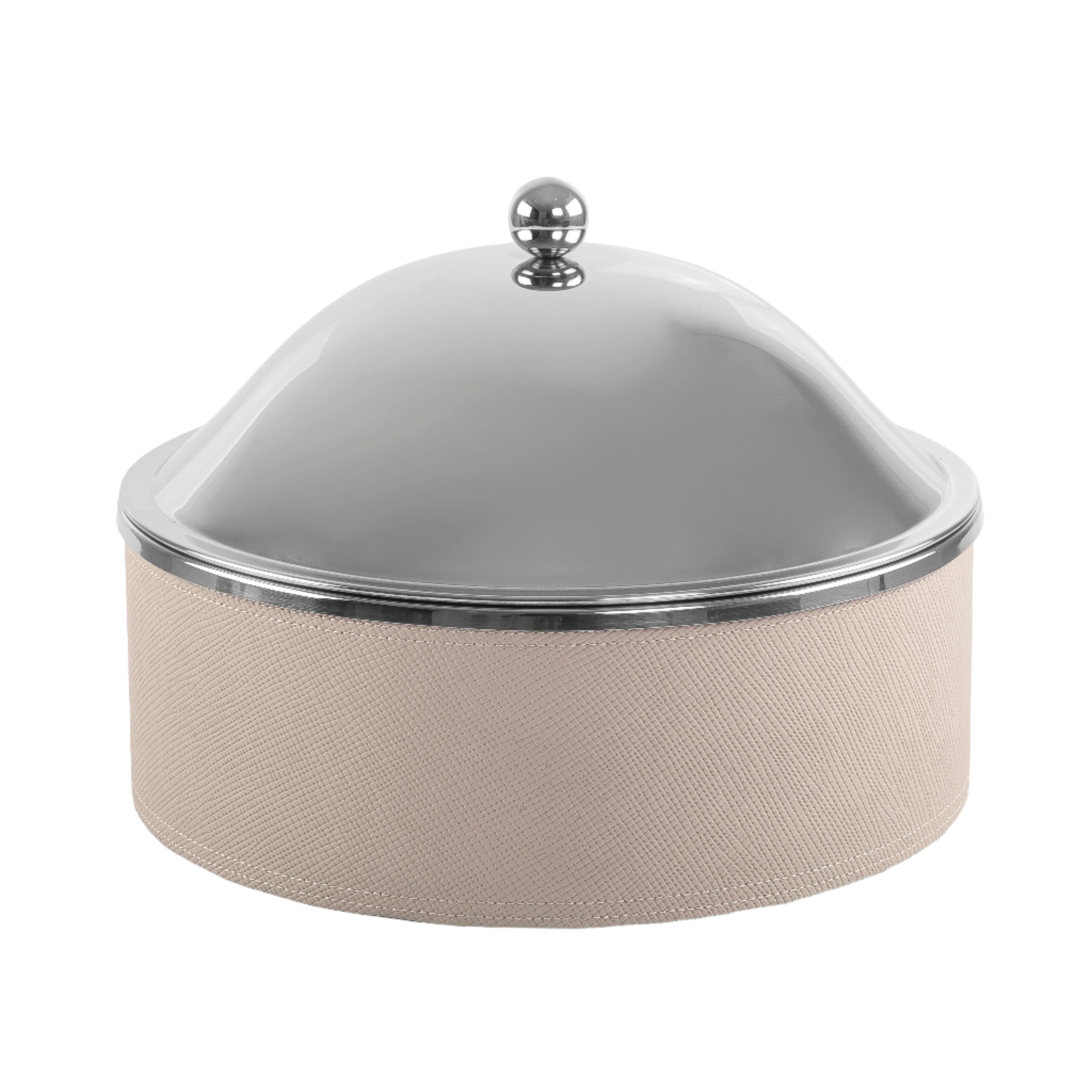 حافظة حرارة دائرية متوسطة الحجم من الإستانلس ستيل، تتميز بقاعدة خشبية متينة، ومغلفة بجلد بيج داكن بشكل أنيق. يجمع تصميمها بين العملية والمظهر الأنيق، مما يجعلها إضافة أنيقة لأي مساحة.
