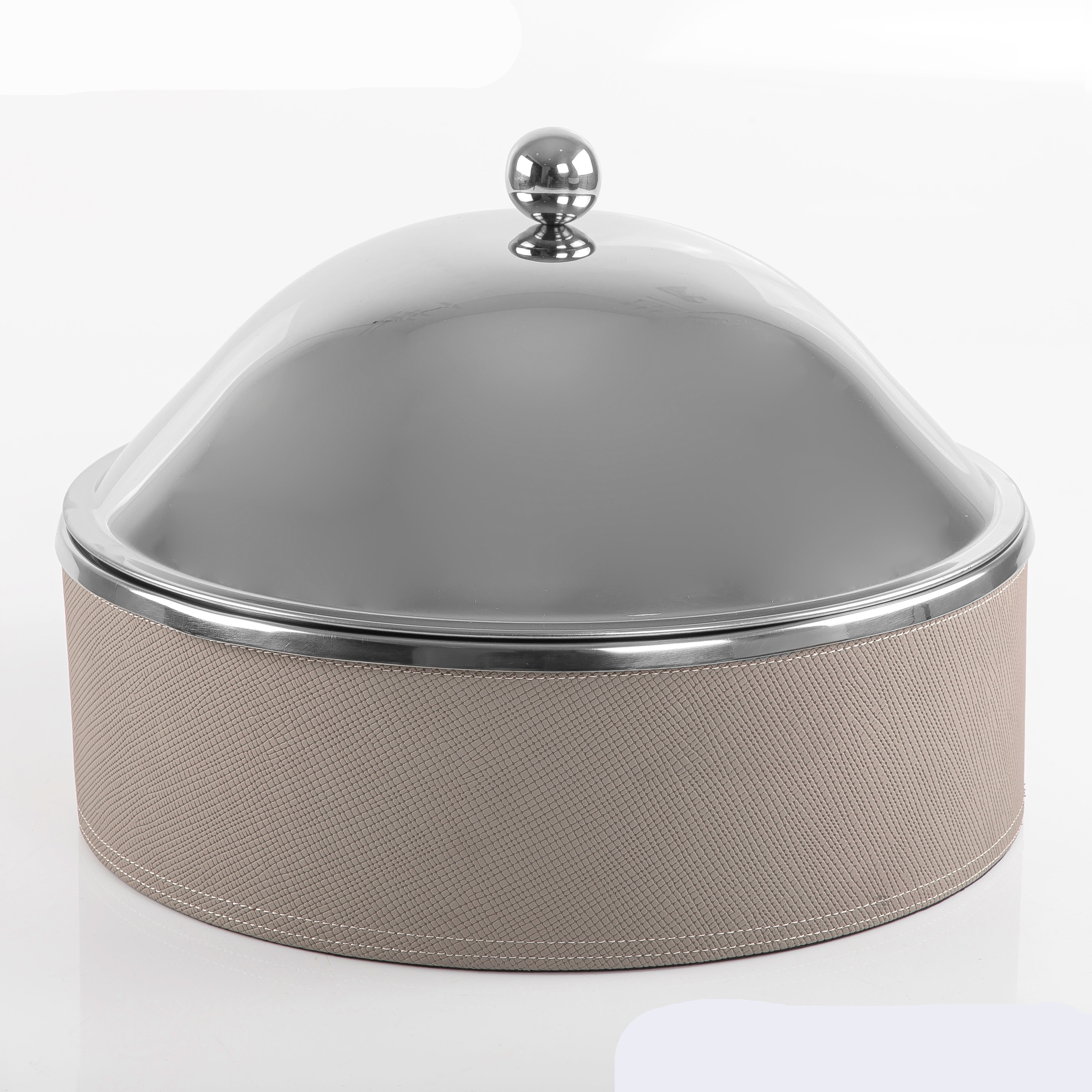 حافظة حرارة دائرية متوسطة الحجم من الإستانلس ستيل، تتميز بقاعدة خشبية متينة، ومغلفة بجلد بني داكن بشكل أنيق. يجمع تصميمها بين العملية والمظهر الأنيق، مما يجعلها إضافة أنيقة لأي مساحة.