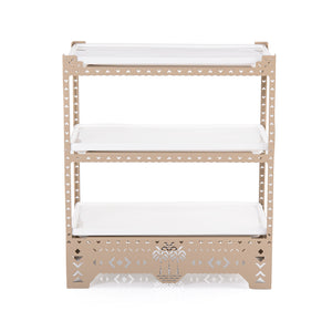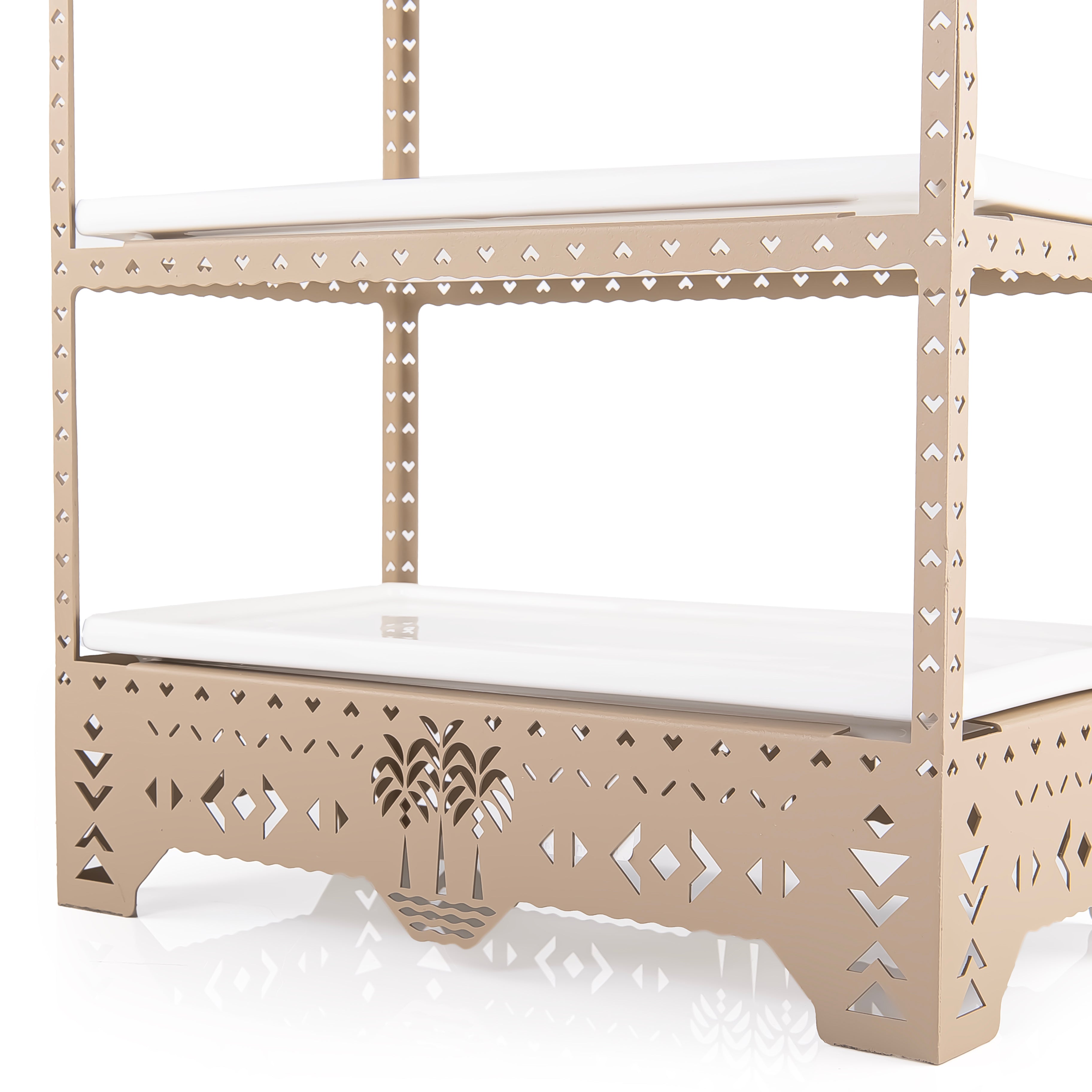 ستاند سيراميكي أنيق ثلاثي الطوابق مع قاعدة معدنية زخرفية مزودة بمقابض.