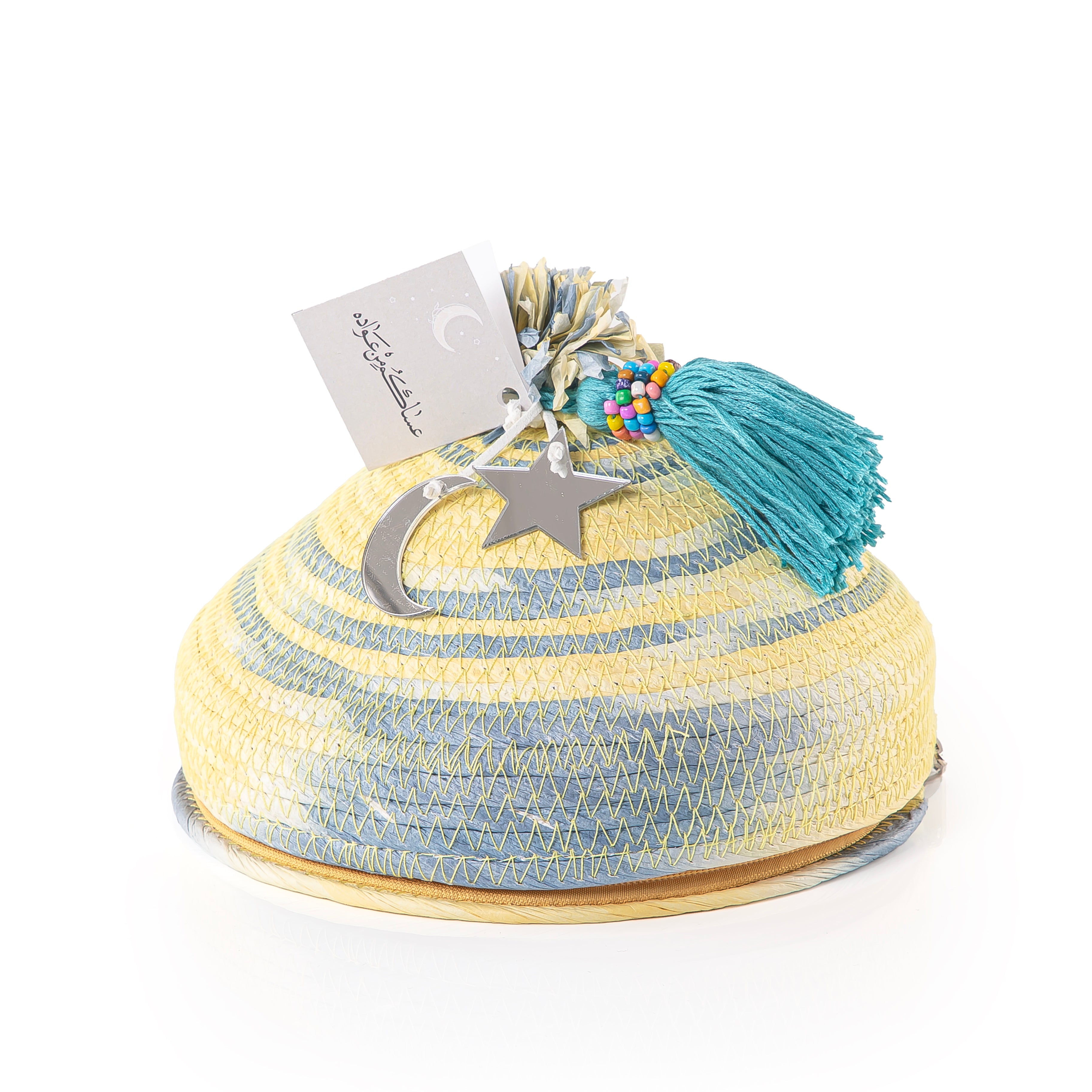 وعاء قرقيعان دائري، محاك يدويًا بخيوط ملونة، مما يضيف لمسة تقليدية.