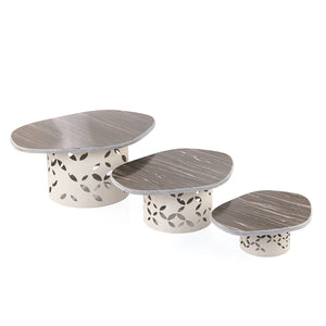 يتكون الطقم من ثلاثة استاندات بأحجام مختلفة لتلبية احتياجات التقديم المتنوعة.