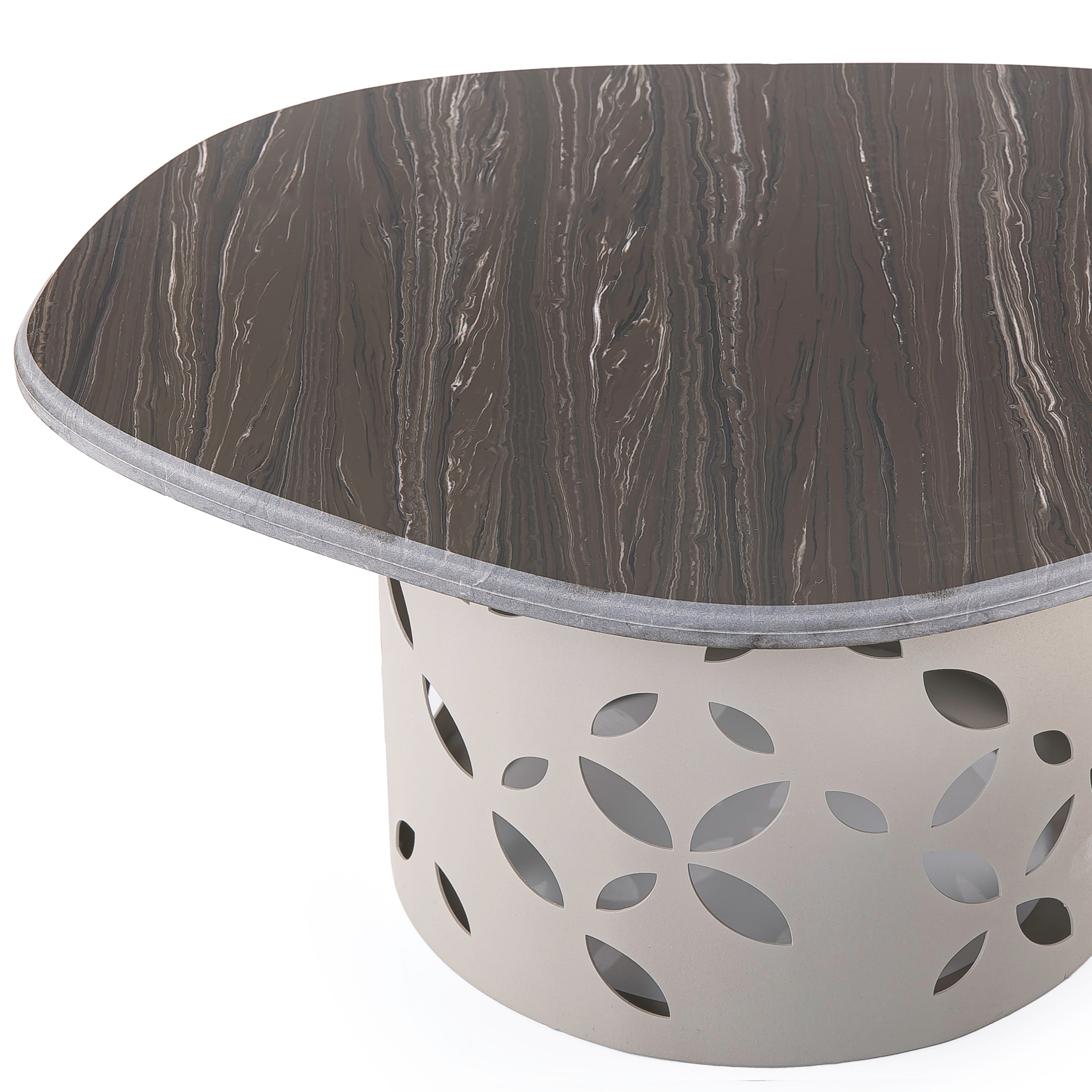 مصنوع من الرخام بسطح أملس وقوي، مع قاعدة معدنية مزخرفة.