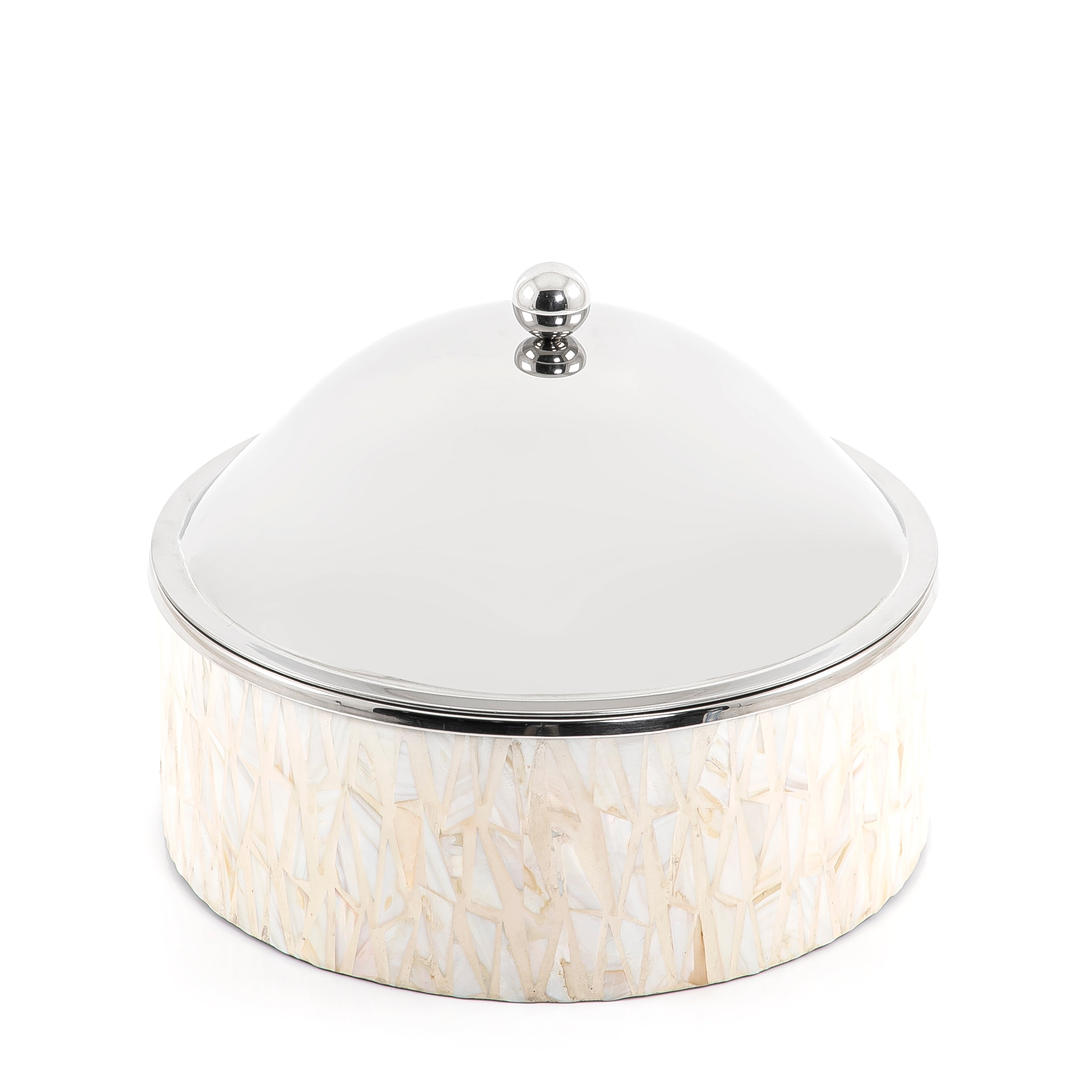 حافظة طعام حرارية مصنوعة من الستانلس ستيل، مع قاعدة مزينة بتفاصيل من الصدف.