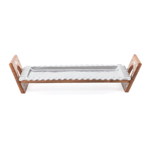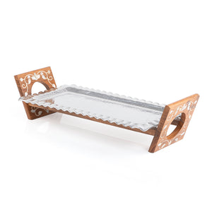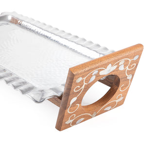 صينية تقديم مستطيلة مصنوعة من الألمنيوم بقاعدة مصنوعة من الخشب والصدف - وسط
